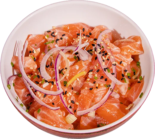 Salmão cortado em cubos marinados em molho de lima, cebola roxa, tabasco, cebolinho e flor de sal