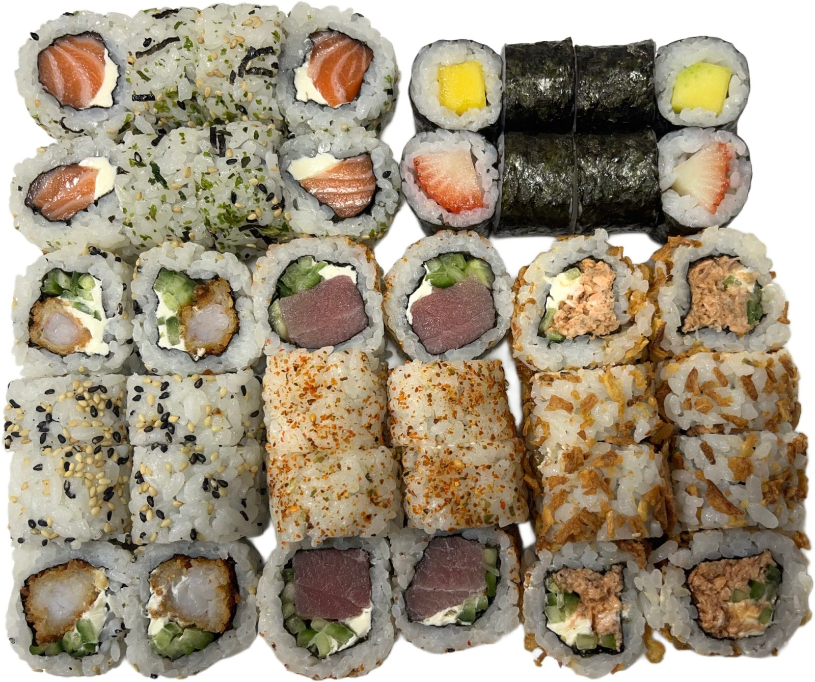 Uramaki Salmão Kimchi (8un) // Hossomaki Manga Morango (8un) // Uramaki Atum Picante (8un) // Uramaki Camarão Kaiyo (8un) // Uramaki Salmão Phila (8un)