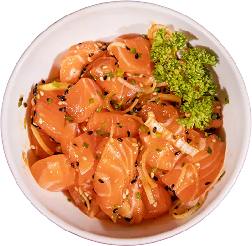 Salmão cortado em cubos temperados com molho kimuchi, alho francês, sementes de sésamo, cebolinho e tougarachi