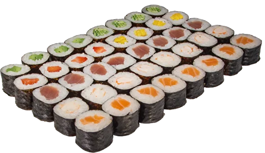 Hossomaki Salmão (8un); Hossomaki Camarão (8un); Hossomaki Atum (8un); Hossomaki Morango (4un); Hossomaki Manga (4un); Hossomaki Abacate (4un) e Hossomaki Pepino (4un)