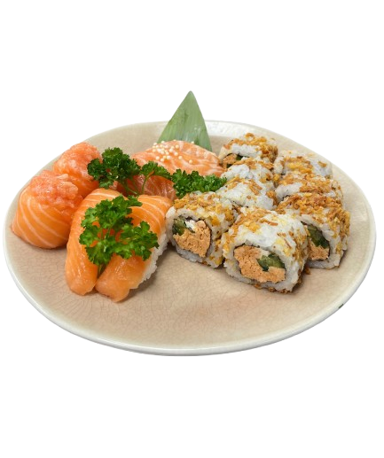 Uramaki salmão kimchi (8un); Nigiri salmão (2un); gunkan salmão phila (2un); sashimi salmão (4un)