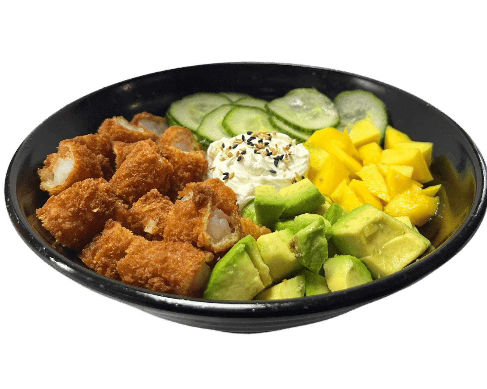 Arroz de sushi, camarão tempura, abacate, manga, pepino, queijo philadelphia e sementes de sésamo