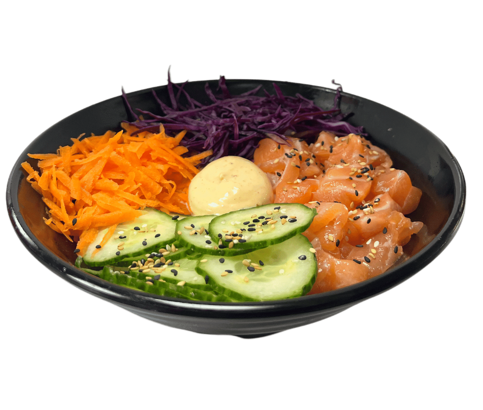 Arroz de sushi, salmão, pepino, cenoura ralada, couve roxa, maionese, japonesa, molho poke e sementes de sésamo
