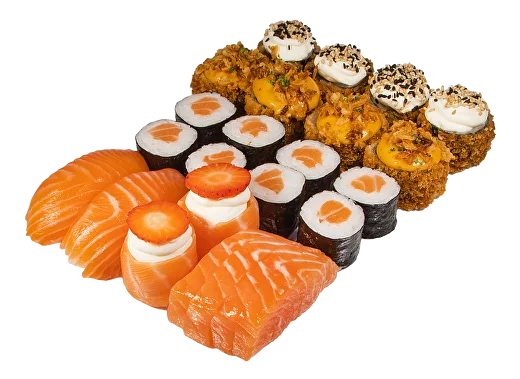 Sashimi salmão (4un); gunkan phila morango (2un); nigiri salmão (2un); hot roll salmao phila sésamo (4un); hot roll salmão crispy (4un); Hossomaki Salmão (8pcs)