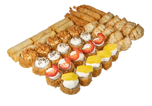 Hot roll salmão crispy (5un); hot roll salmão phila sésamo (5un); hot roll salmão phila/morango (5un); hot roll salmão phila/manga (5un); gyozas camarão (5un); gyozas frango (5un); camarão tempura (4un); mini crepes de legumes (6un)