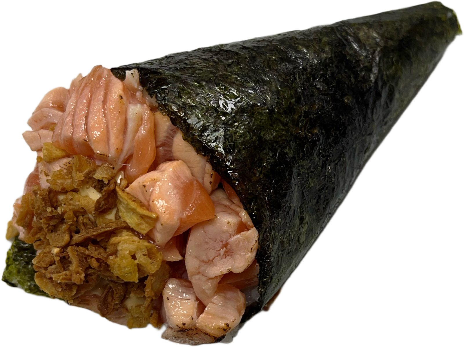 Nori, arroz de sushi, salmão, braseado cortado em cubos, maionese japonesa e cebola crispy