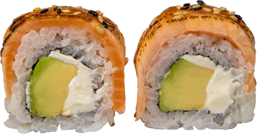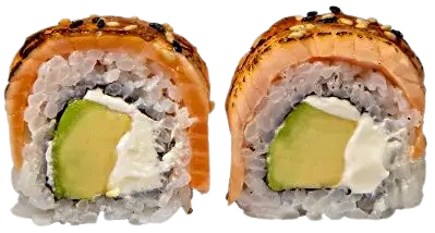 Nori, arroz de sushi, salmão, abacate, queijo philadelphia, açúcar mascavado e sementes de sésamo (8un)