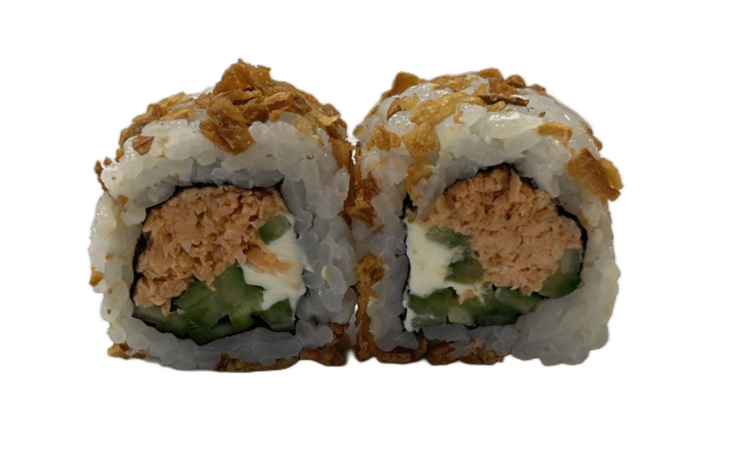 Nori, arroz de sushi, salmão marinado com kimchi, queijo philadelphia, pepino, cebola crocante