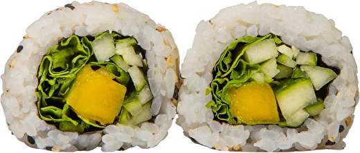 Nori, arroz de sushi, manga, pepino, rúcula e sementes de sésamo (8un)