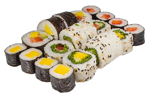 Hossomaki morango/manga (8un); uramaki morango/manga/rúcula (8un); futomaki veggie (4un)