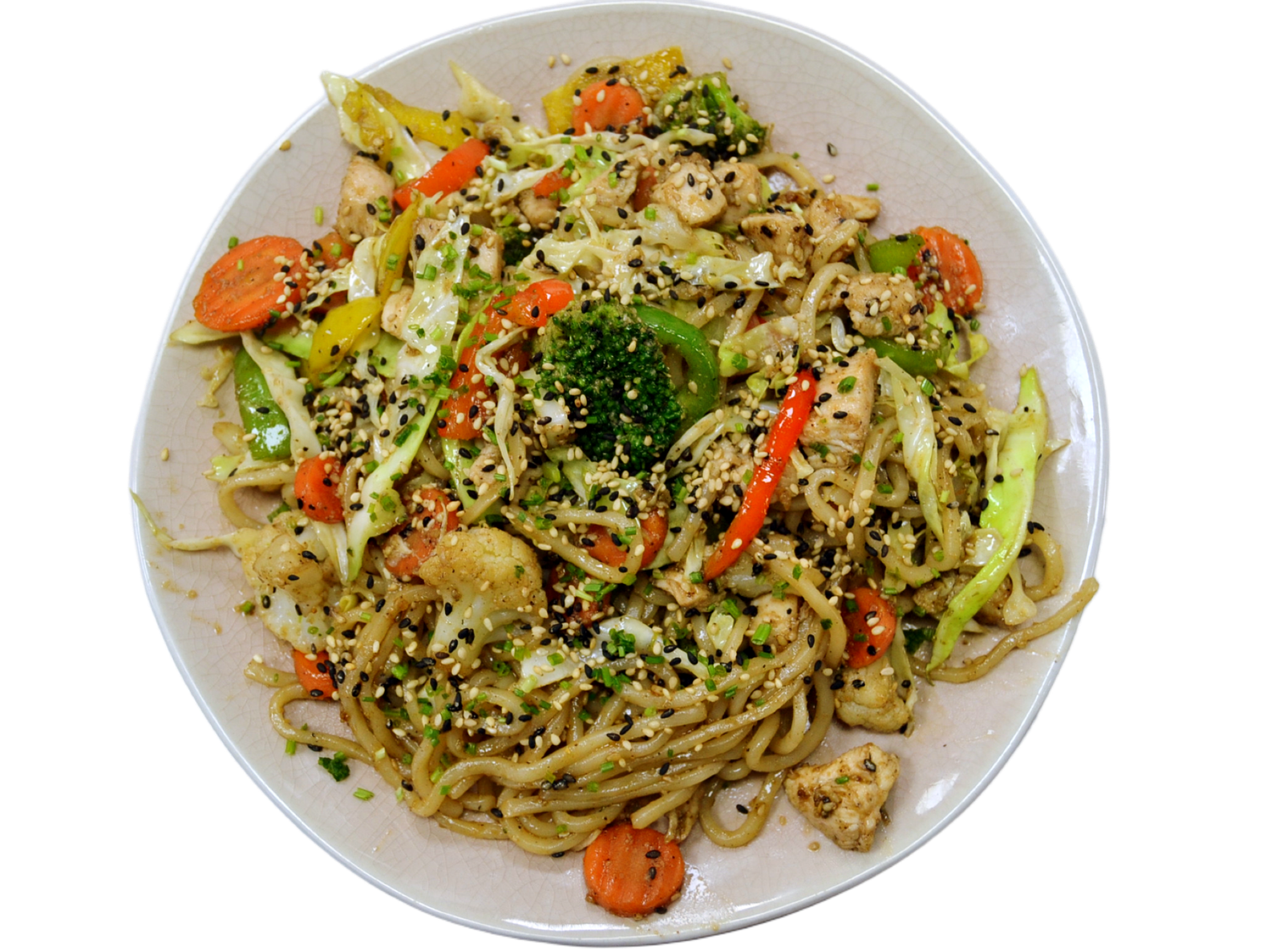 Massa, frango, pimentos, cenoura, brócolos, couve flor, couve coração, molho especial, cebolinho e sementes de sésamo